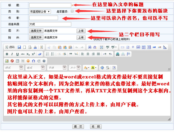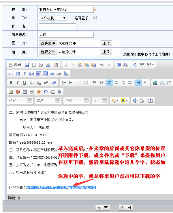 根據(jù)上圖完成編輯后,直接可以把各種文檔以附件方式上傳,以方便用戶下載瀏覽。就能完成文章的發(fā)布。下面說下附件的上傳辦法。